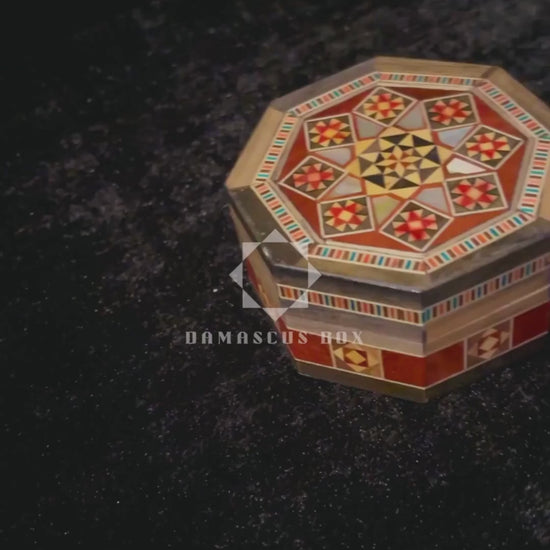 mini ośmiokątne pudełko mozaikowe, ręcznie robione pudełko Damascene, pudełko na biżuterię z masy perłowej, pamiątka Bliskiego Wschodu, pudełko z drewna orzecha włoskiego, unikalny pomysł na prezent, ręcznie wykonane pudełko drewniane, kulturowa sztuka mozaikowa, pudełko z Damaszku, pudełko syryjskie, prezent dla niej, prezent dla niego