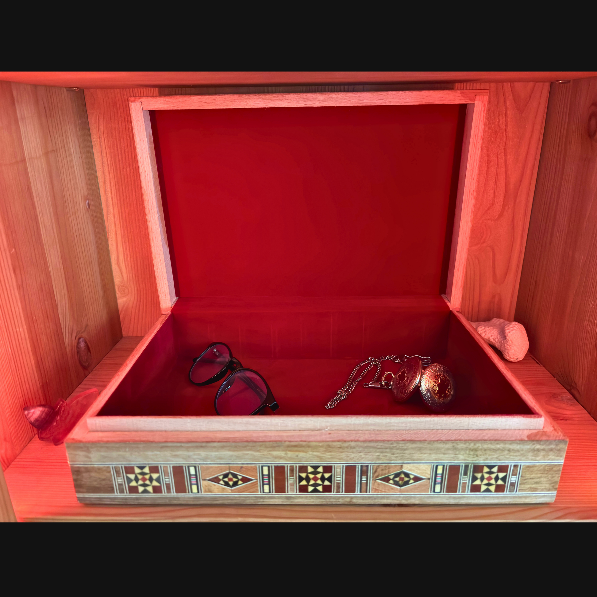 Doświadcz elegancji tradycyjnego rzemiosła z Damaszku dzięki temu dużemu prostokątnemu pudełku mozaikowemu, starannie wykonanemu ręcznie z wysokogatunkowego drewna buka. Zaprojektowane dla osób ceniących wyrafinowaną sztukę i ponadczasowy design, to pudełko jest idealne do bezpiecznego przechowywania biżuterii, zegarków, cygar, delikatnych pamiątek lub cennych drobiazgów.