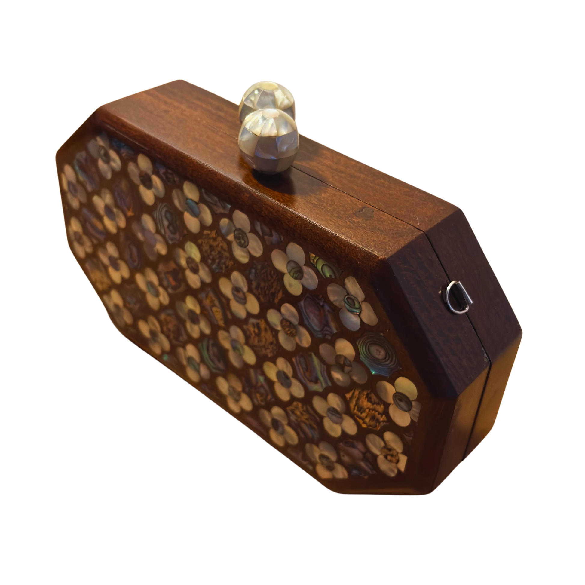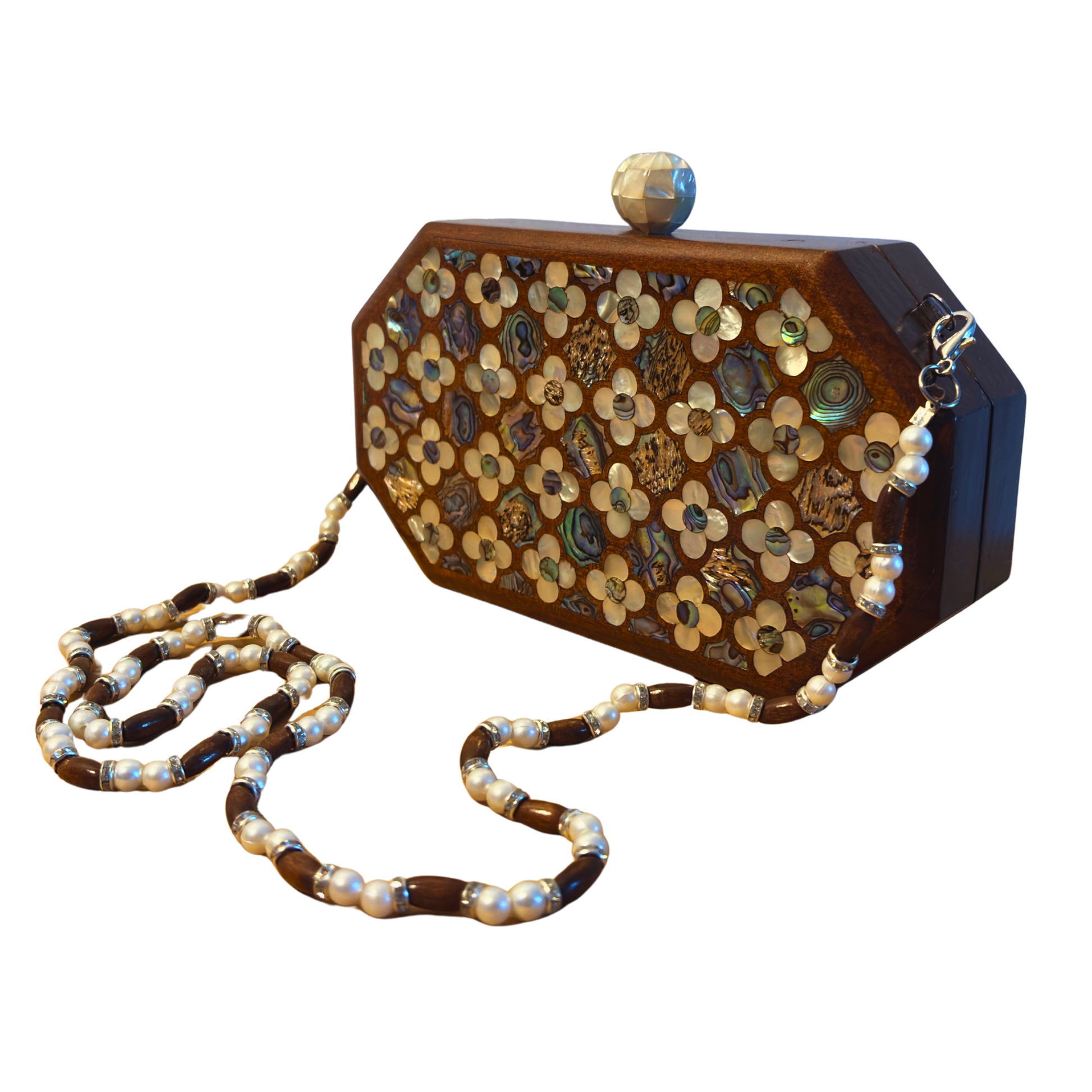 Jouri – Pochette Damasquine de Luxe avec Nacre Florale & Chaîne de Perles