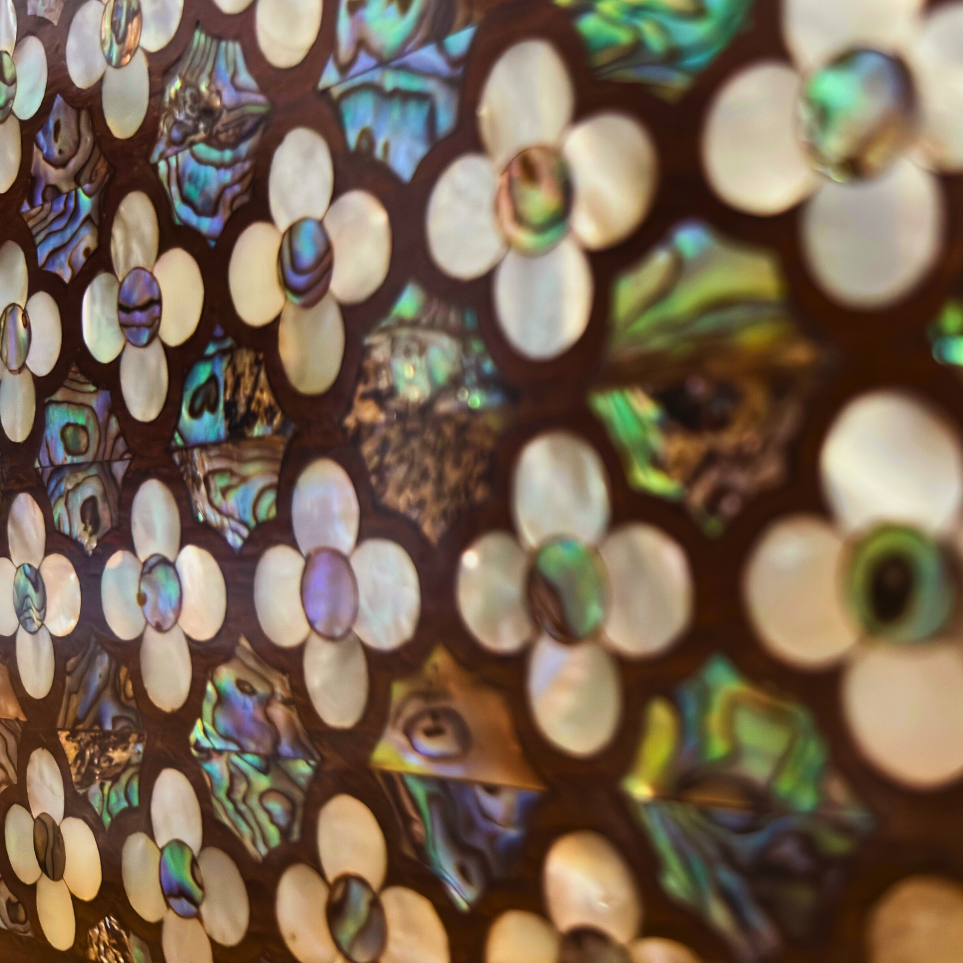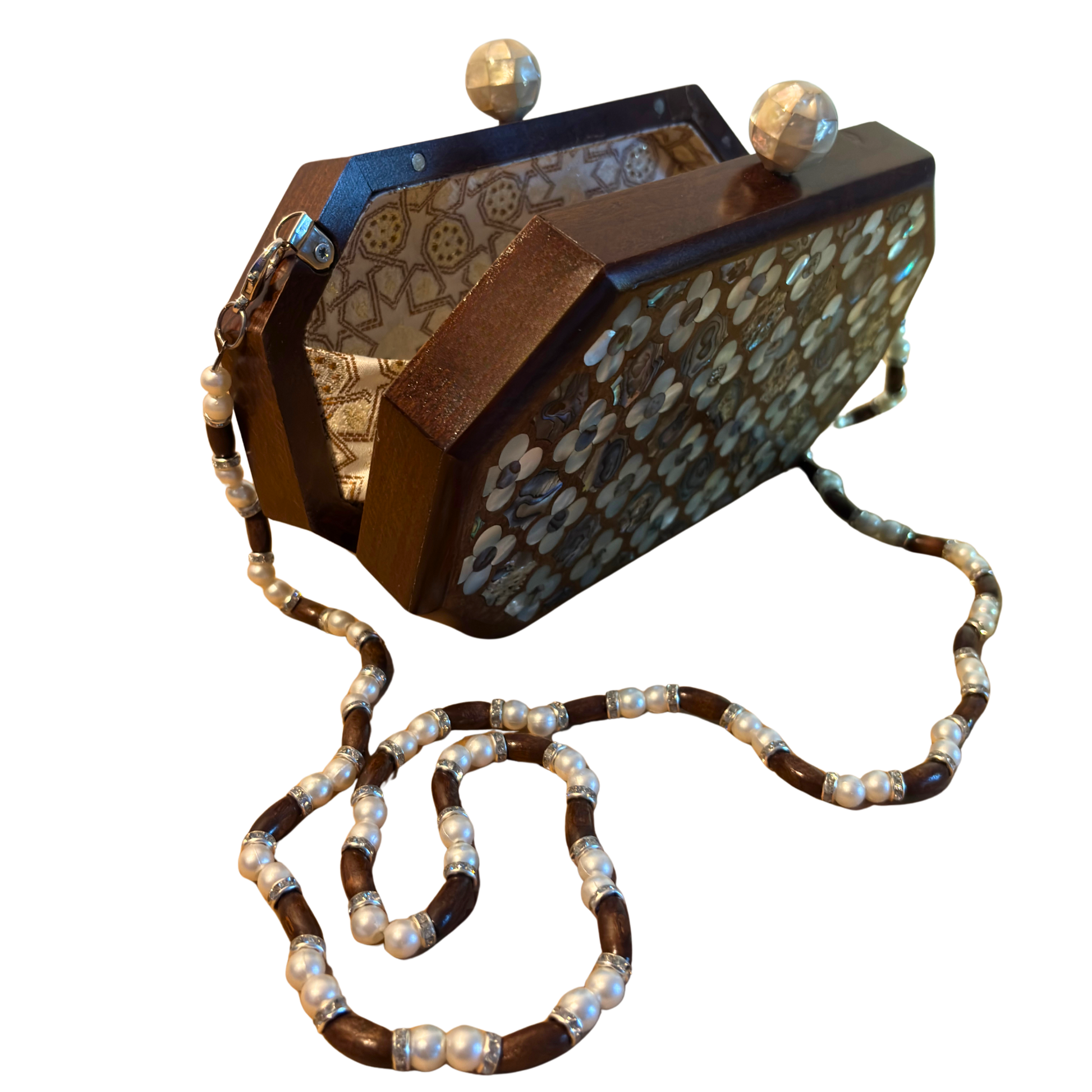• Matériaux : Bois de noyer, nacre (rose damascène), chaîne de perles & métal, brocart damascène